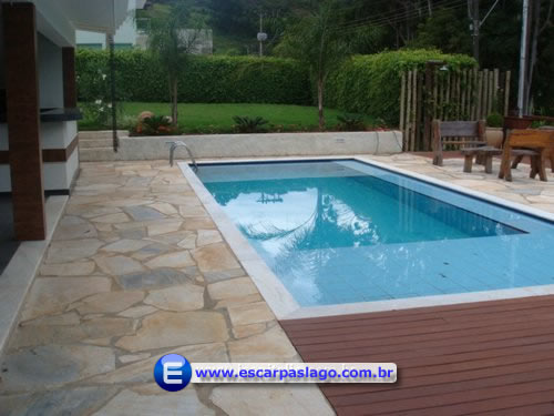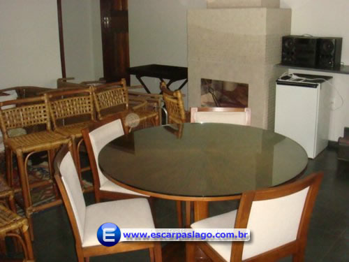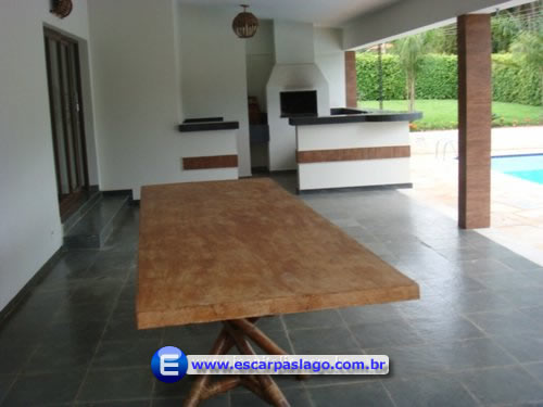 - Área de lazer com piscina e praia molhada, mesa grande, churrasqueira com área de pia e fogão.